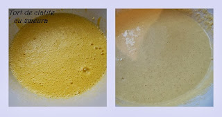 Intr-un bol mixam ouale spuma cu zaharul si untul de la temperatura camerei.