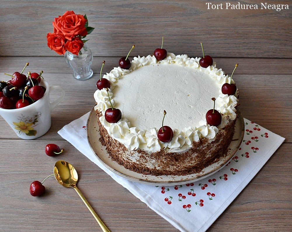 Asezati o alta foaie de blat, crema, restul de cirese si ultima foaie de blat.